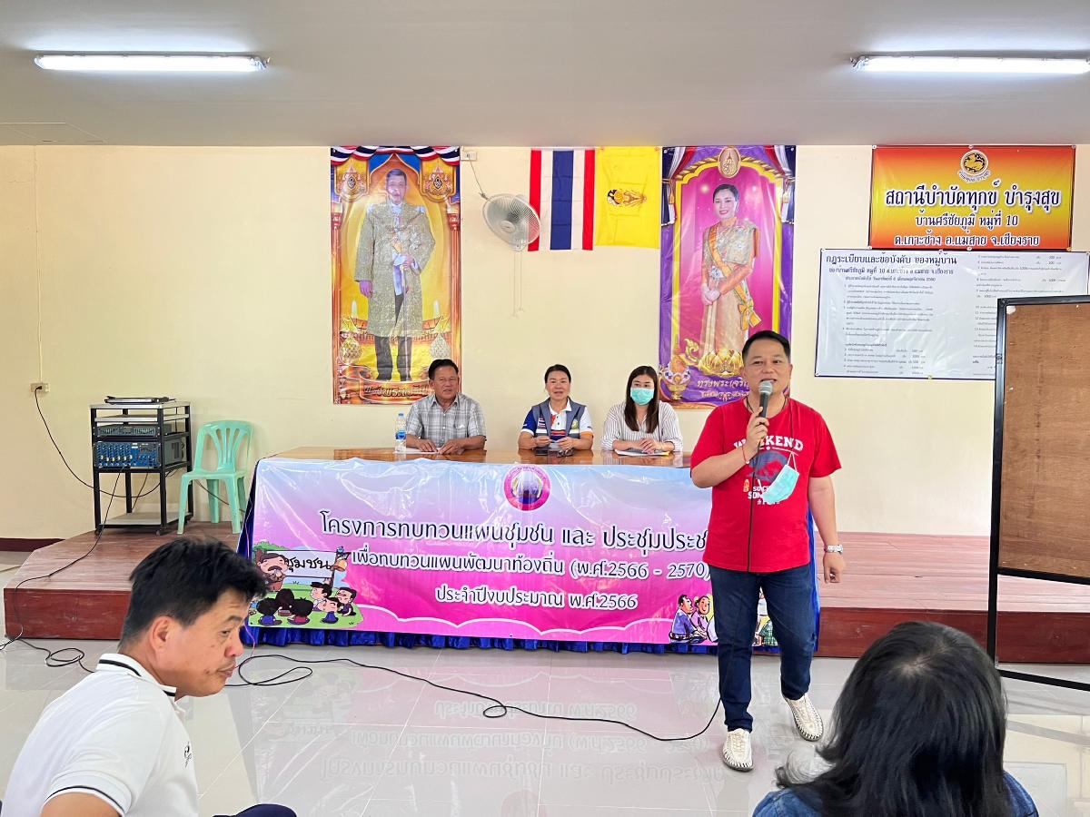 วันที่ 19 กุมภาพันธ์ 2566 เวลา 13.00 น. ร้อยตำรวจเอกเด่นวุฒิ จันต๊ะขัติ นายกองค์การบริหารส่วนตำบลเกาะช้าง มอบหมายให้ นายสุปรีดา ศรีธิดวง รองปลัดองค์การบริหารส่วนตพบลเกาะช้าง พร้อม นางสาวดวงพร โพธิ์ศรี นักวิเคราะห์นโยบายและแผน และเจ้าหน้าที่องค์การบริการส่วนตำบลเกาะช้าง ร่วมกับ สมาชิกสภาองค์การบริหารส่วนตำบลเกาะช้าง ผู้ใหญ่บ้าน และชาวบ้านศรีชัยภูมิ หมู่ 10 ร่วมประชุมโครงการทบทวนแผนชุมชนและประชุมประชาคม เพื่อทบทวนแผนพัฒนาท้องถิ่น (พ.ศ.2566-2570) ประจำปีงบประมาณ พ.ศ. 2566 ณ ศาลาเอนกประสงค์ บ้านศรีชัยภูมิ หมู่ 10 ตำบลเกาะช้าง อำเภอแม่สาย จังหวัดเชียงราย