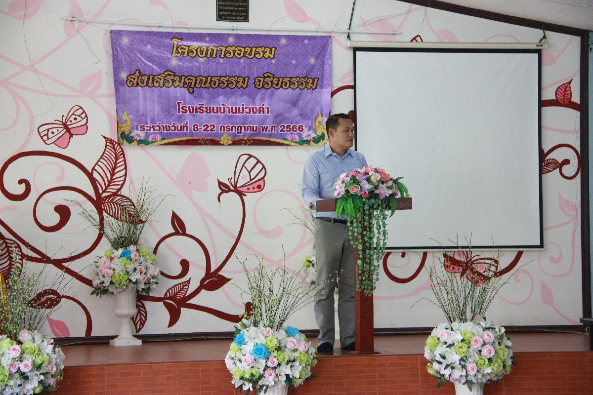 วันที่ 15 กรกฎาคม 2566เวลา 09.00 น. ร้อยตำรวจเอกเด่นวุฒิ จันต๊ะขัติ นายกองค์การบริหารส่วนตำบลเกาะช้าง มอบหมายให้นายอนุวัฒน์ พรหมมิ รองนายกองค์การบริหารส่วนตำบลเกาะช้าง ร่วมพิธีเปิดอบรมโครงการส่งเสริมคุณธรรมจริยธรรม ณ อาคารเอนกประสงค์โรงเรียนบ้านม่วงคำ บ้านม่วงคำ ตำบลเกาะช้าง อำเภอแม่สาย จังหวัดเชียงราย