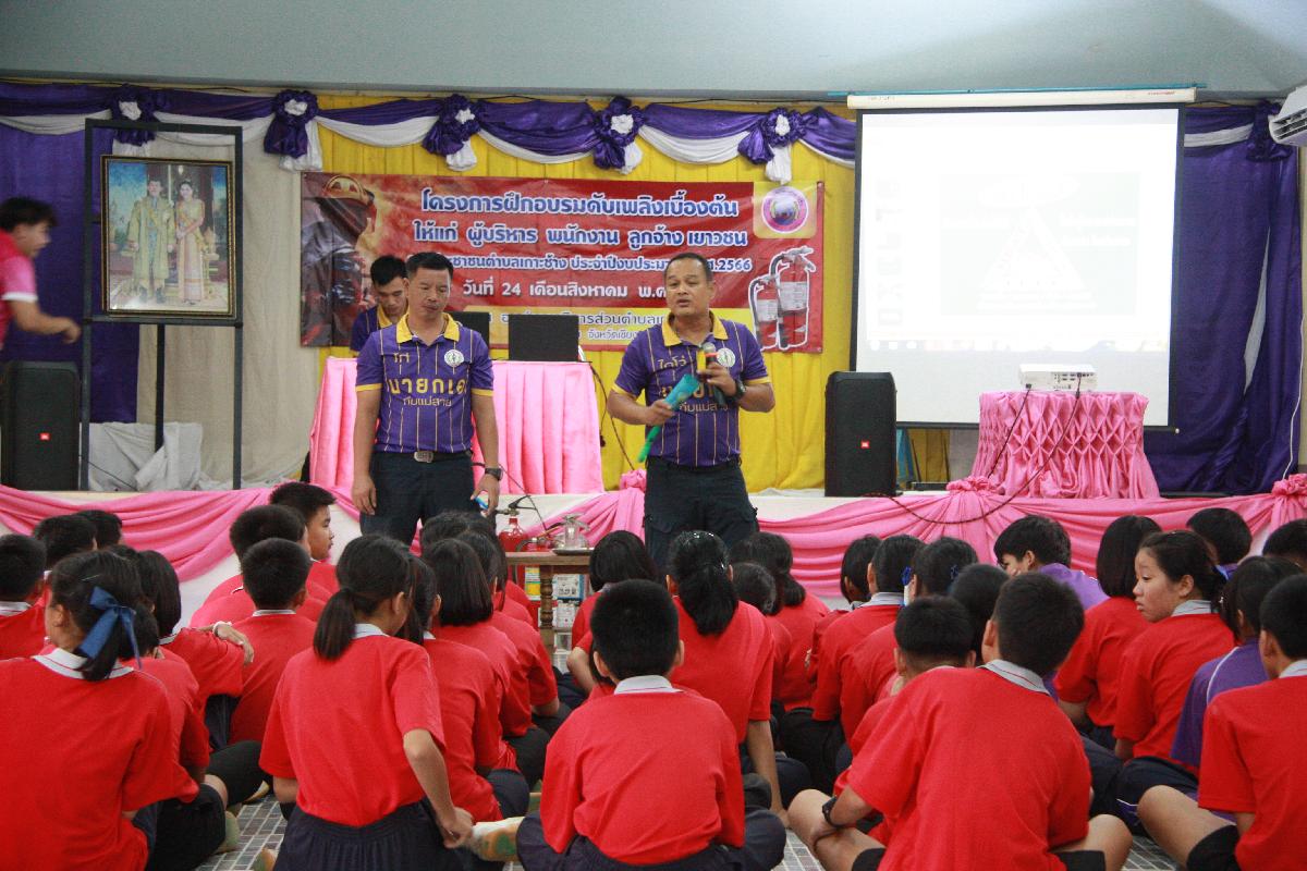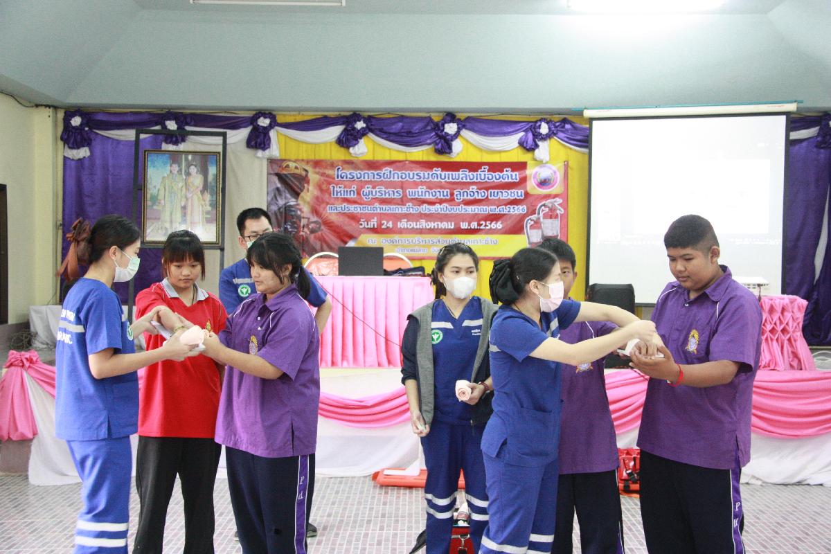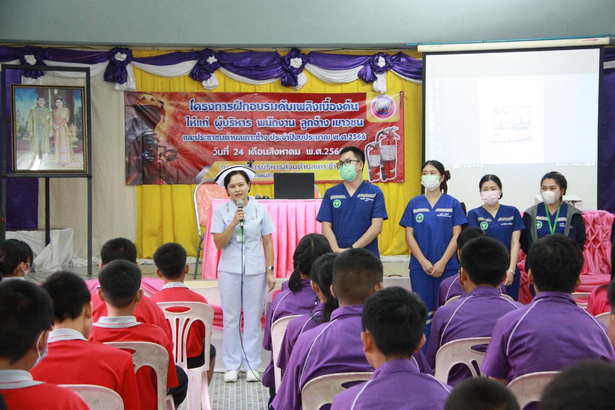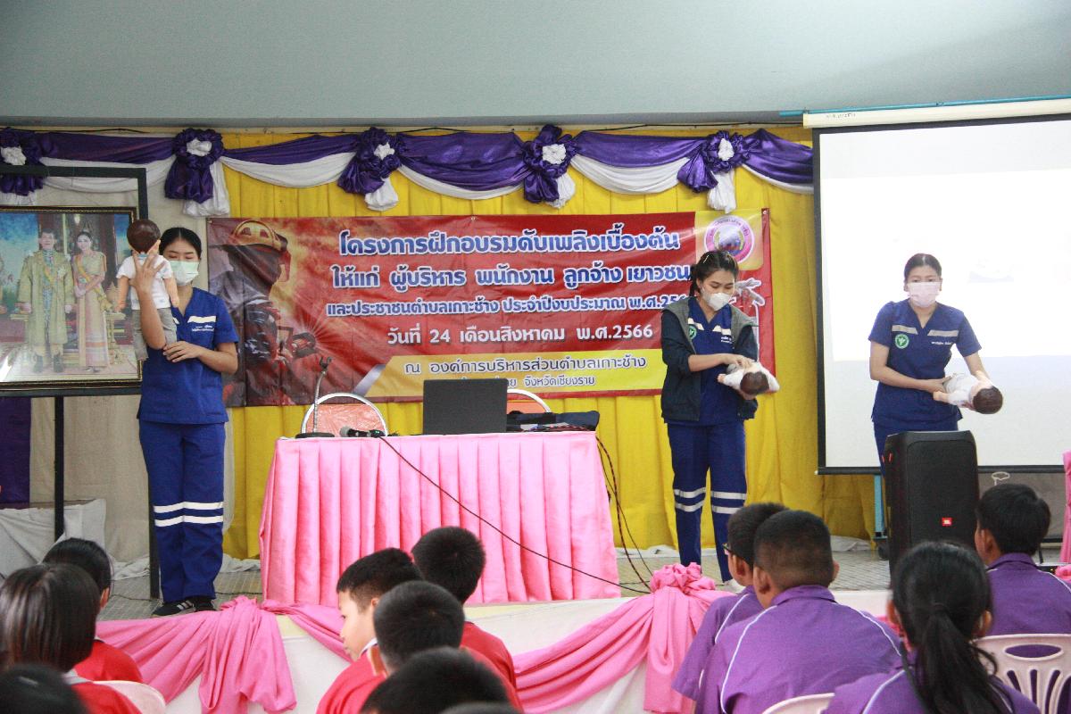 วันที่ 24 สิงหาคม 2566 เวลา 09.00 น. องค์การบริหารส่วนตำบลเกาะช้าง นำโดย ร้อยตำรวจเอกเด่นวุฒิ จันต๊ะขัติ นายกองค์การบริหารส่วนตำบลเกาะช้าง มอบหมายให้ นางสาวอัจฉรา สกุลวา หัวหน้าสำนักปลัด พร้อม นายยุทธวี สุภาแก้ว นักป้องกันและเบาเทาสาธารณภัยสำนักปลัด จัดกิจกรรมโครงการฝึกอบรมดับเพลิงเบื้องต้น ให้แก่ผู้บริหาร พนักงาน ลูกจ้างเยาวชนและประชาชนตำบลเกาะช้างประจำปีงบประมาณ พ.ศ. 2566 โดยช่วยเช้าเป็นการอบรมการปฐมพยาบาลเบื้องต้นการทำ CPR