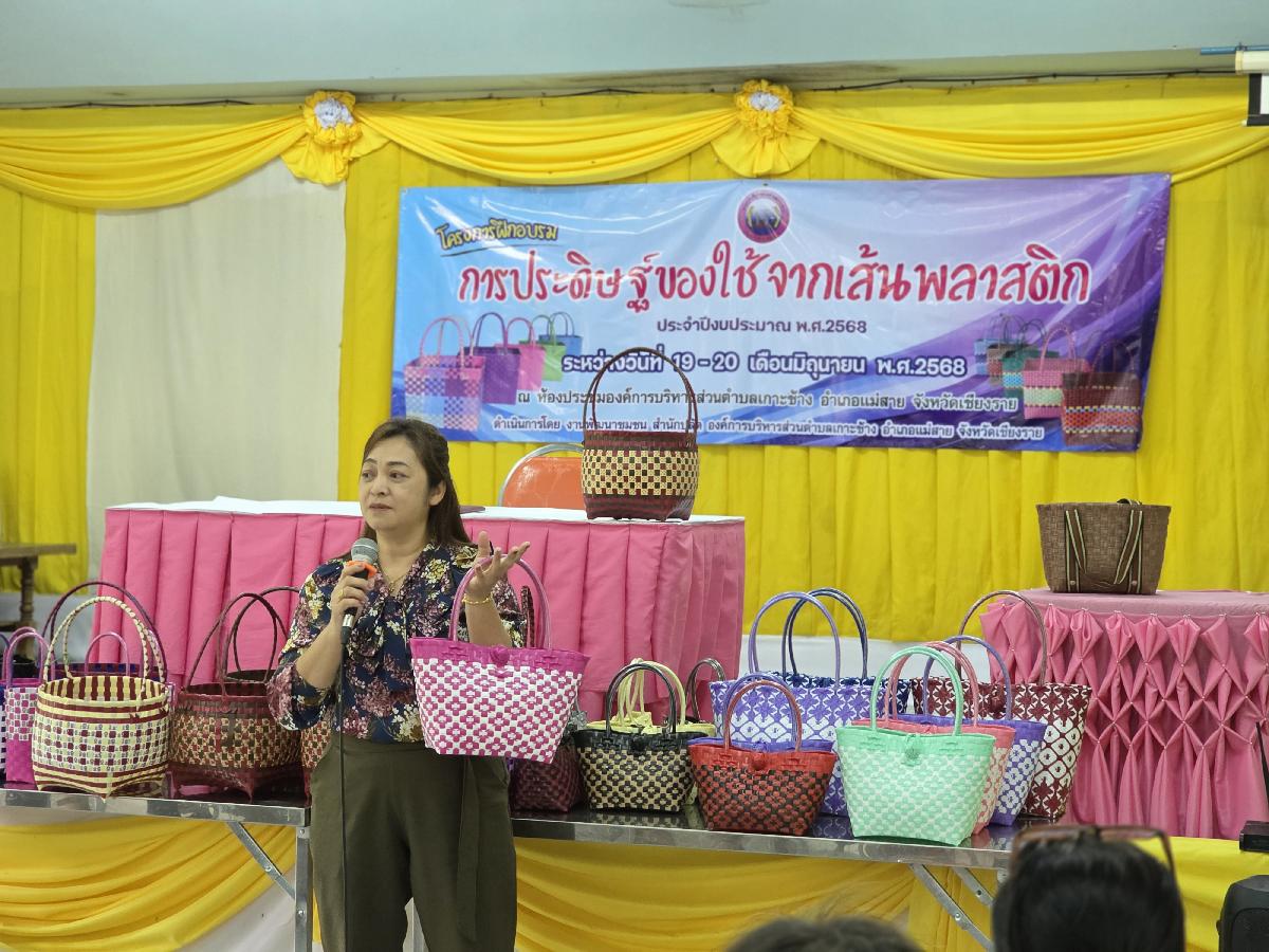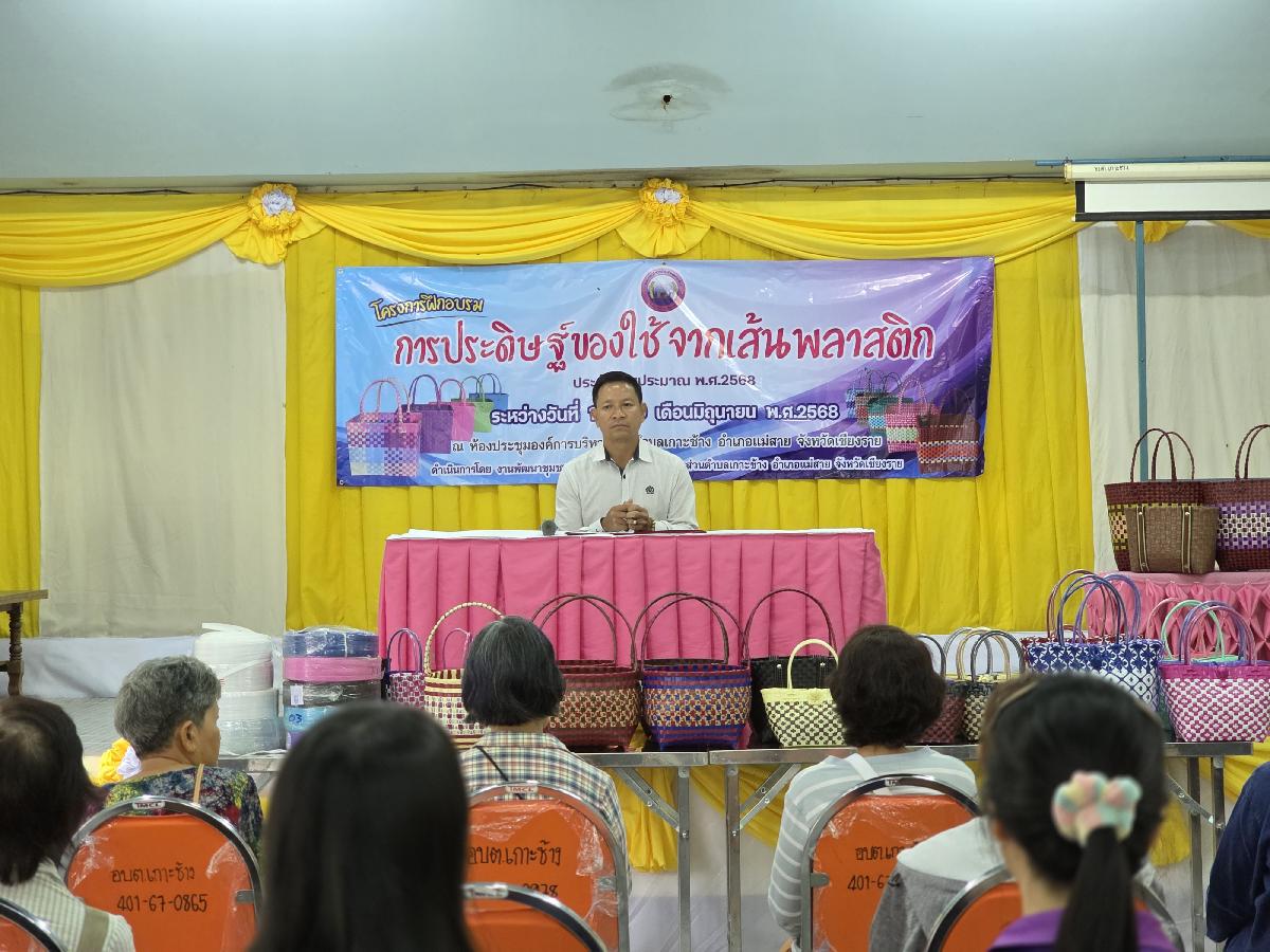 วันที่ 19-20 มิถุนายน 2568 องค์การบริหารส่วนตำบลเกาะช้าง นำโดย ร้อยตำรวจเอกเด่นวุฒิ จันต๊ะขัติ นายกองค์การบริหารส่วนตำบลเกาะช้าง พร้อม หัวหน้าส่วนราชการ งานพัฒนาชุมชน สำนักปลัด องค์การบริหารส่วนตำบลเกาะช้าง จัดกิจกรรมโครงการฝึกอบรมการประดิษฐ์ของใช้จากเส้นพลาสติก ประจำปีงบประมาณ พ.ศ. 2568 ณ ห้องประชุมองค์การบริหารส่วนตำบลเกาะช้าง อำเภอแม่สาย จังหวัดเชียงราย