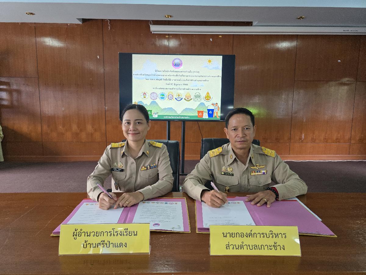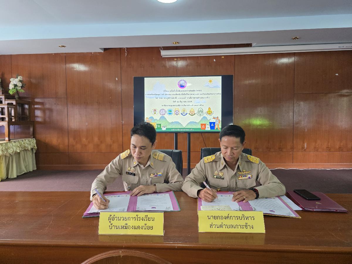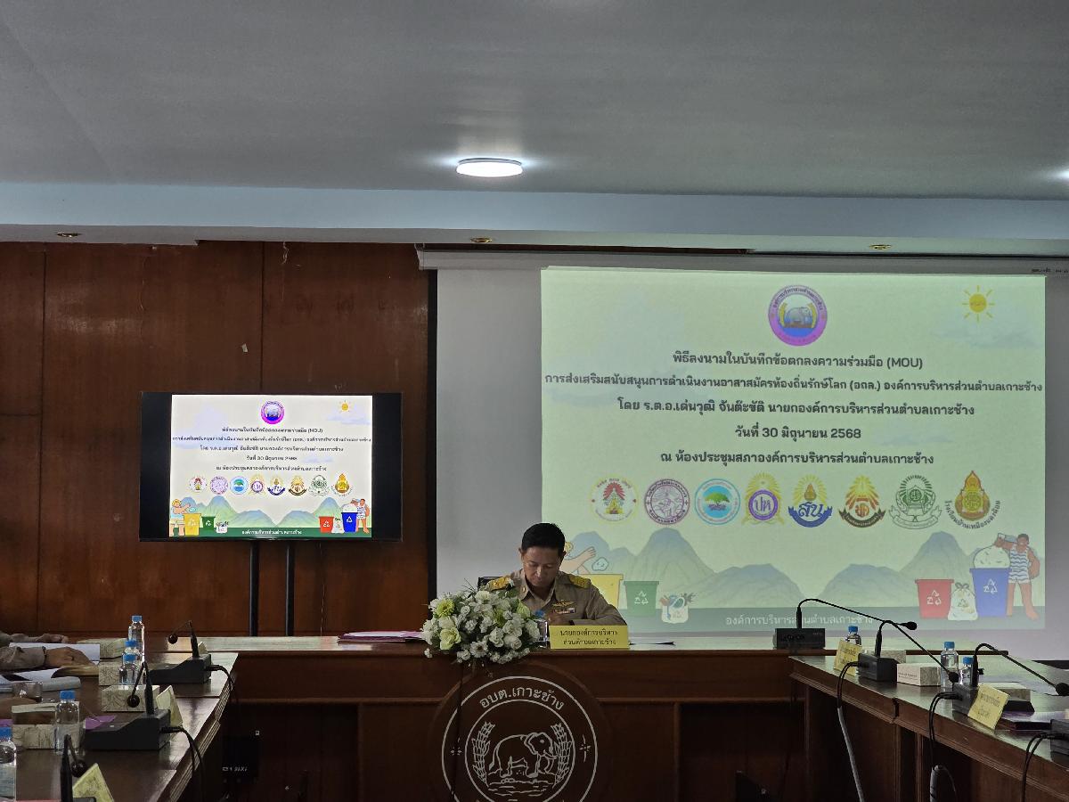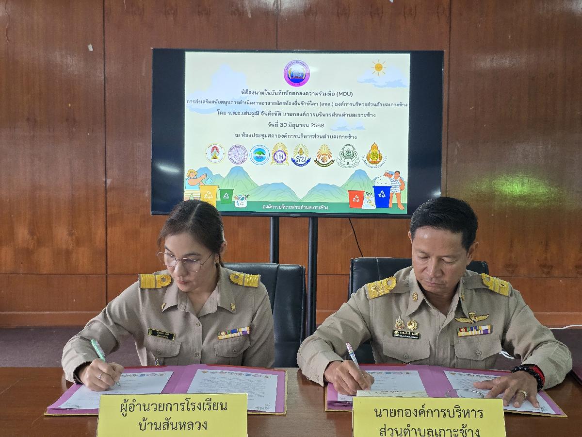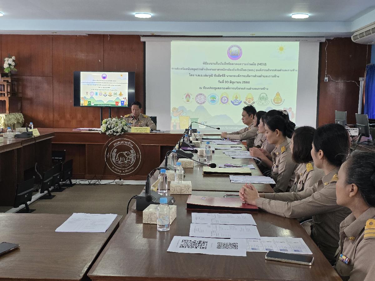 วันที่ 30 มิถุนายน 2568 เวลา 09.00 น. องค์การบริหารส่วนตำบลเกาะช้าง นำโดย ร้อยตำรวจเอกเด่นวุฒิ จันต๊ะขัติ นายกองค์การบริหารส่วนตำบลเกาะช้าง พร้อม นายสุปรีดา ศรีธิดวง รองปลัด และเจ้าหน้าที่งานสาธารณสุข สำนักปลัดองค์การบริหารส่วนตำบลเกาะช้าง ร่วมกับ ผู้อำนวยการสถานศึกษา 8 โรงเรียน ร่วมกันลงนามในบันทึกข้อตกลงความร่วมมือ(MOU)การส่งเสริมสนับสนุนการดำเนินงานอาสาสมัครท้องถิ่นรักษ์โลก(อถล.)องค์การบริหารส่วนตำบลเกาะช้าง ณ ห้องประชุมสภาองค์การบริหารส่วนตำบลเกาะช้าง