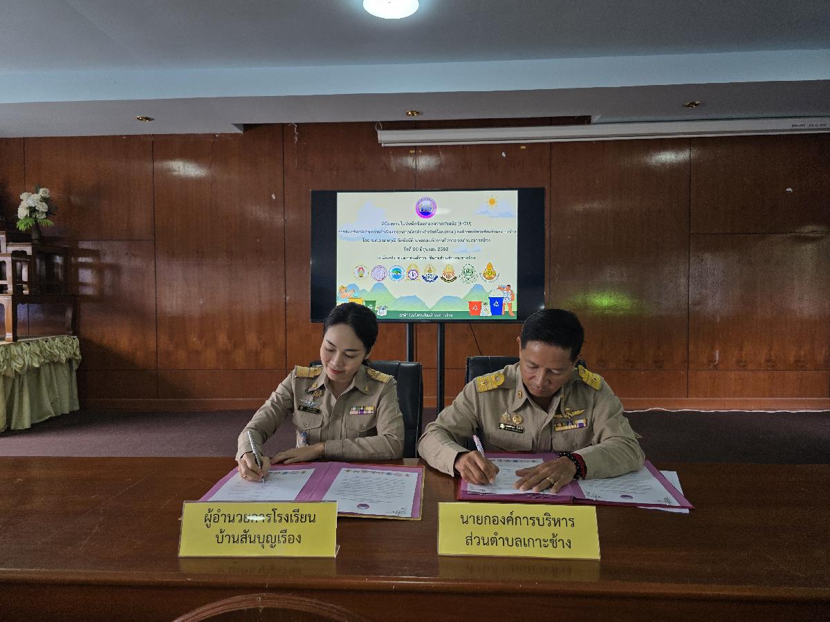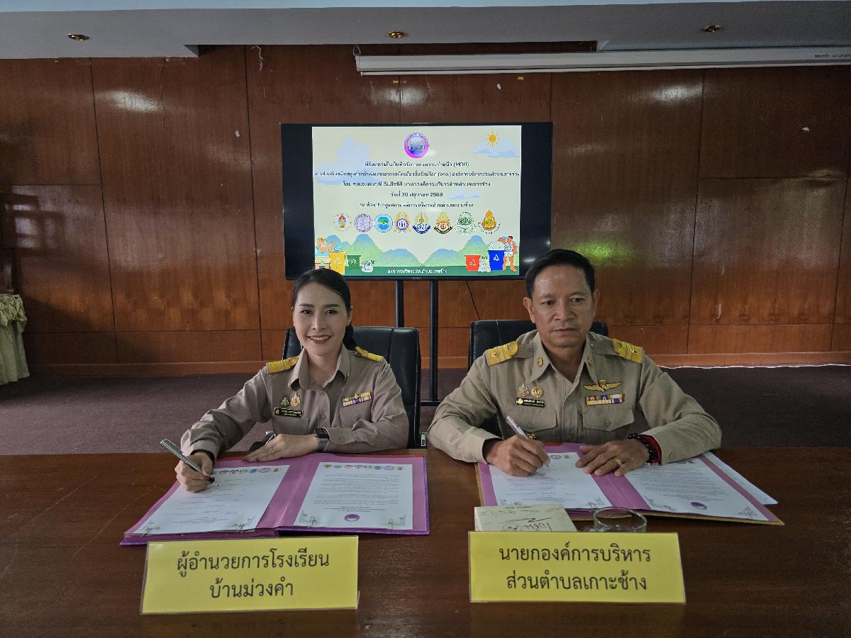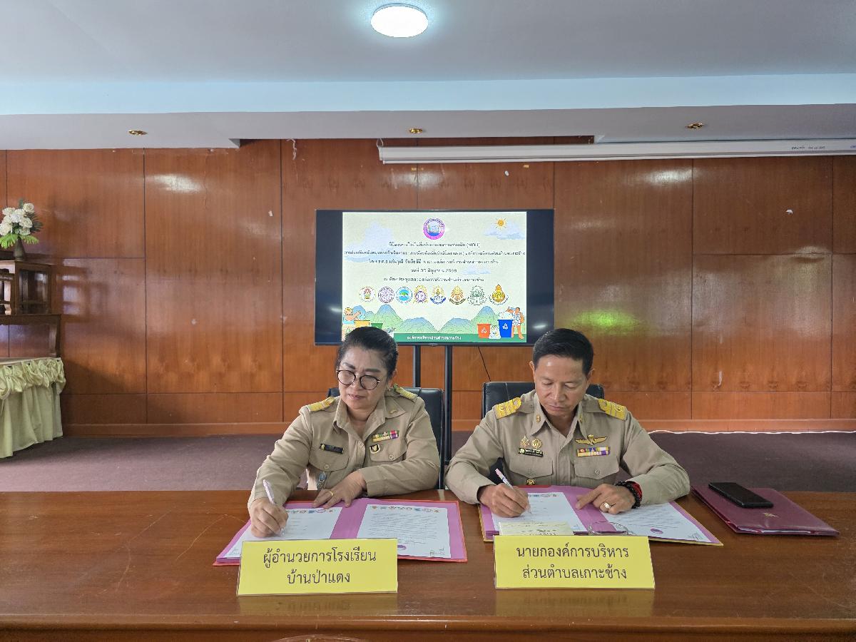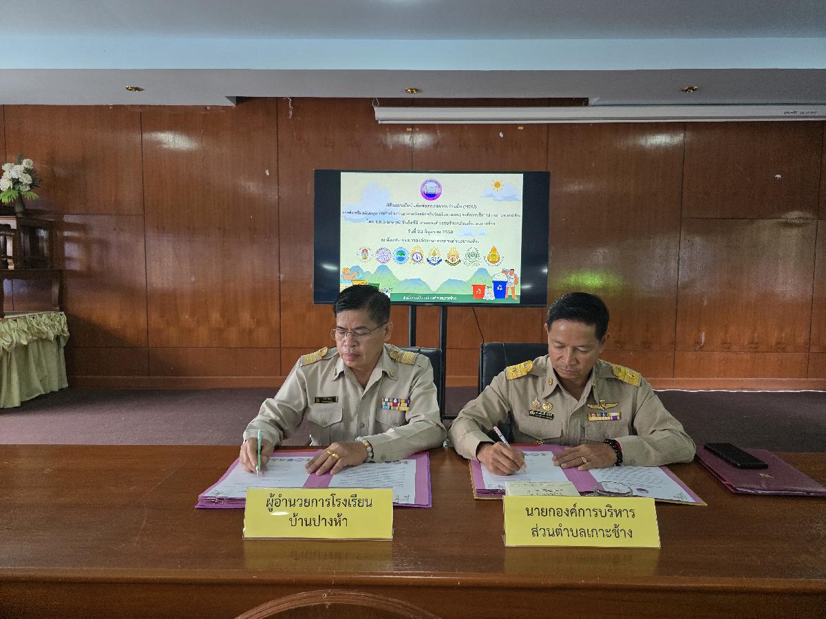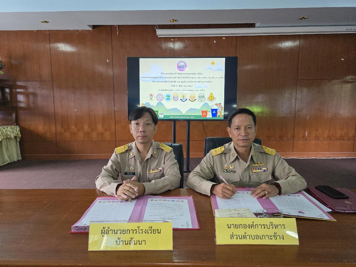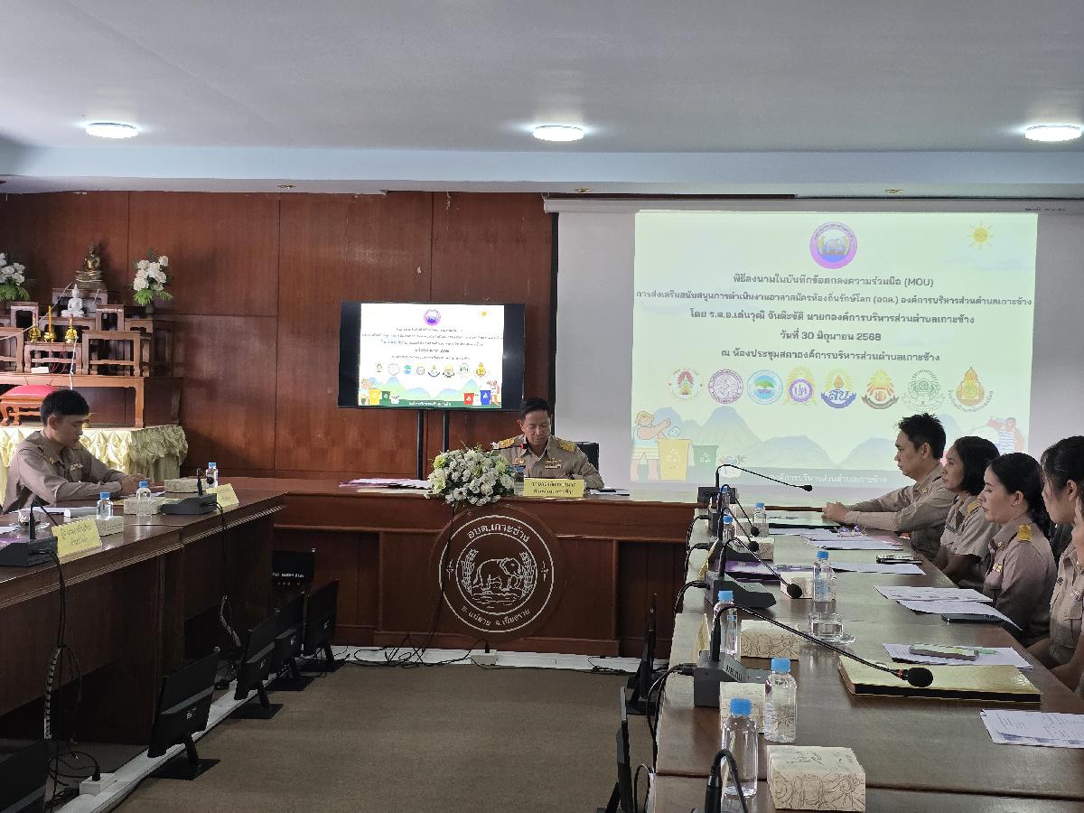 วันที่ 30 มิถุนายน 2568 เวลา 09.00 น. องค์การบริหารส่วนตำบลเกาะช้าง นำโดย ร้อยตำรวจเอกเด่นวุฒิ จันต๊ะขัติ นายกองค์การบริหารส่วนตำบลเกาะช้าง พร้อม นายสุปรีดา ศรีธิดวง รองปลัด และเจ้าหน้าที่งานสาธารณสุข สำนักปลัดองค์การบริหารส่วนตำบลเกาะช้าง ร่วมกับ ผู้อำนวยการสถานศึกษา 8 โรงเรียน ร่วมกันลงนามในบันทึกข้อตกลงความร่วมมือ(MOU)การส่งเสริมสนับสนุนการดำเนินงานอาสาสมัครท้องถิ่นรักษ์โลก(อถล.)องค์การบริหารส่วนตำบลเกาะช้าง ณ ห้องประชุมสภาองค์การบริหารส่วนตำบลเกาะช้าง