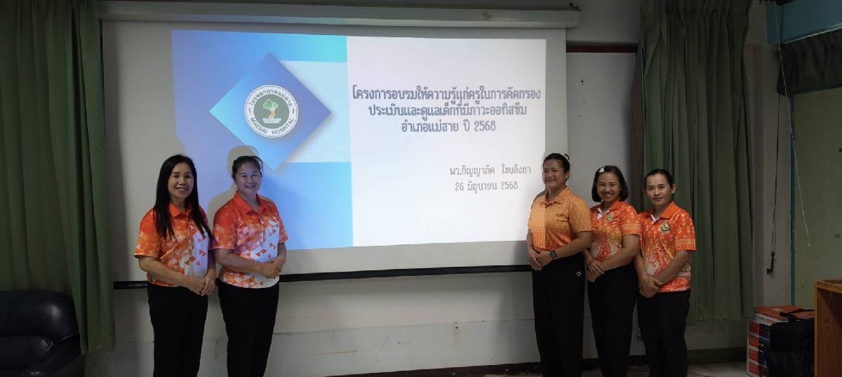 วันที่ 26 มิถุนายน 2568 เวลา 13.00 น. คณะครูบุคลากรทางการศึกษาร่วมอบรมเชิงปฏิบัติการการให้ความรู้แก่ครูในการคัดกรองประเมินและดูแลเด็กที่มีภาวะออทิสซึม ประจำปี 2568 ณ ห้องประชุมโรงพยาบาลแม่สาย