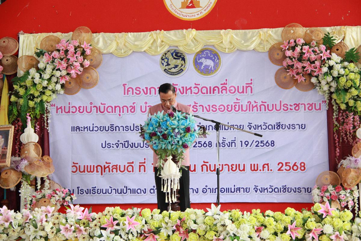 โดยในช่วงเช้า ผู้ว่าราชการจังหวัดเชียงราย และนายกเหล่ากาชาดจังหวัดเชียงราย พร้อมคณะ ได้ลงพื้นที่เยี่ยมเยียนและมอบสิ่งของแก่ผู้สูงอายุกลุ่มเปราะบางในพื้นที่ ก่อนเป็นประธานเปิดงานอย่างเป็นทางการ โดยมีนายวรายุทธ ค่อมบุญ นายอำเภอแม่สาย กล่าวต้อนรับในพิธีเปิดโครงการ "หน่วยบำบัดทุกข์บำรุงสุขสร้างรอยยิ้มให้กับประชาชน" ครั้งที่ 19/2568 ณ โรงเรียนบ้านป่าแดง ตำบลเกาะช้าง อำเภอแม่สาย จังหวัดเชียงราย