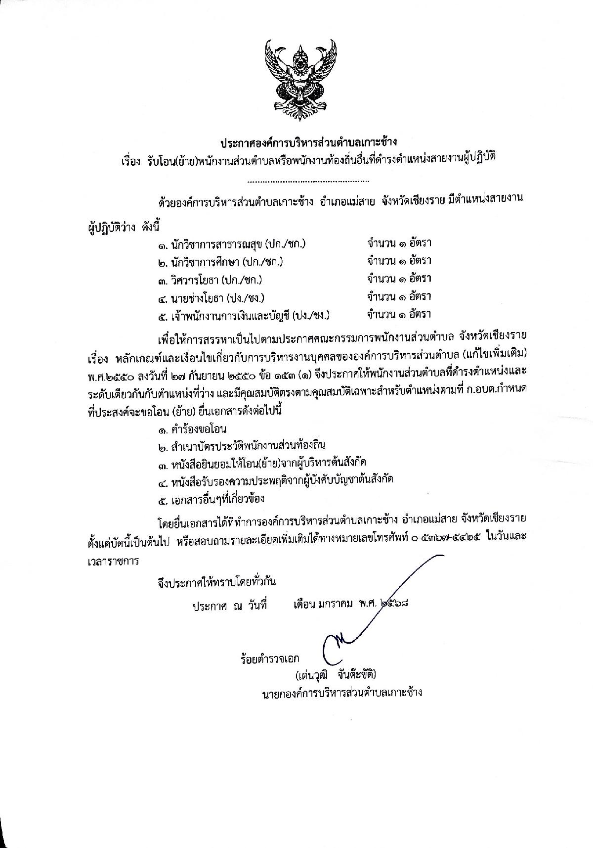 ด้วยองค์กาบริหารส่วนตำบลกาะช้าง อำเภอแม่สาย จังหวัดเชียงราย มีตำแหน่งสายงานผู้ปฏิบัติว่าง ดังนี้