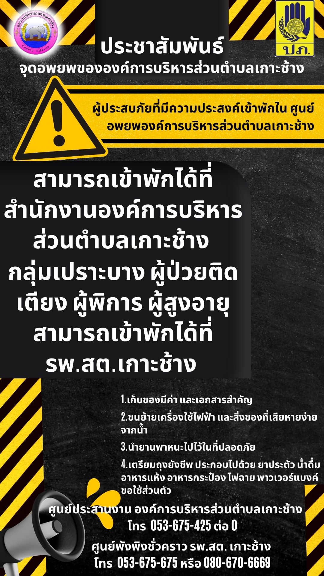 งานป้องกันและบรรเทาสาธารณภัย โทร. 053-675425 ต่อ 0