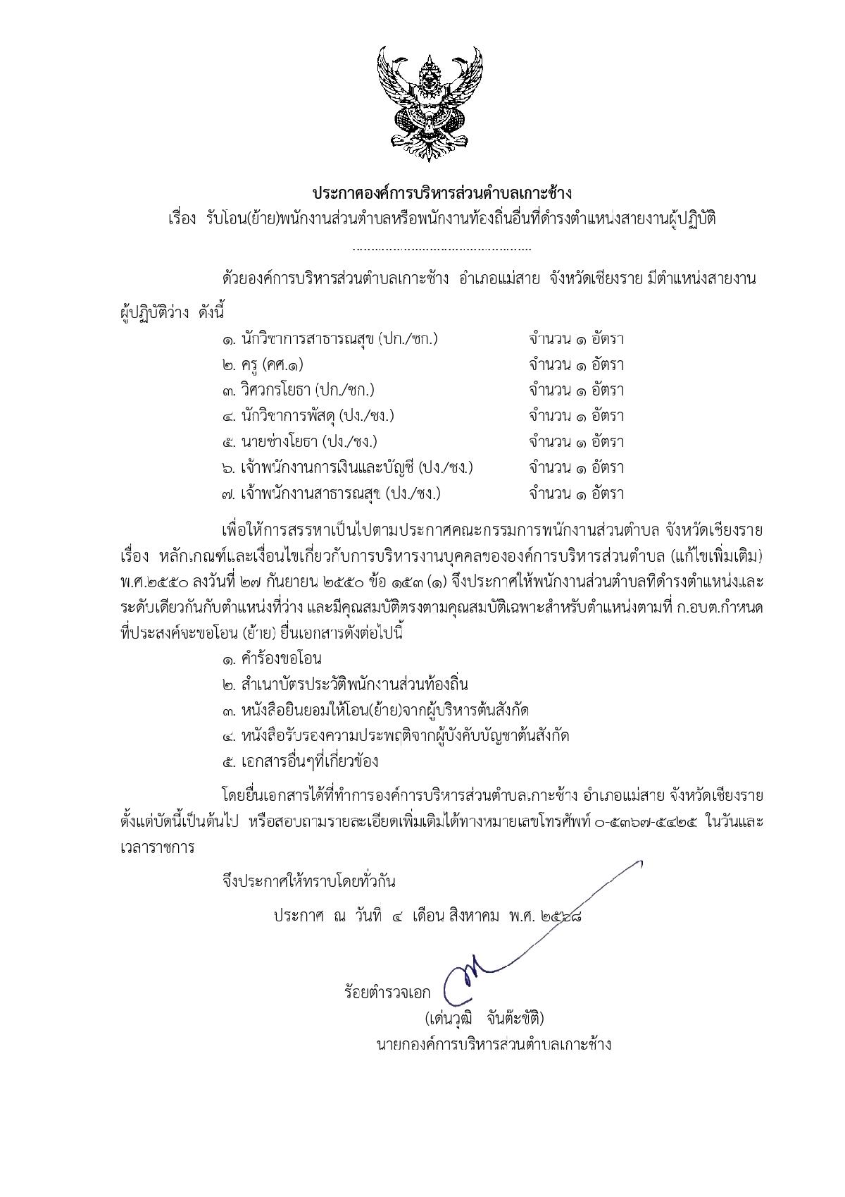 ด้วยองค์การบริหารส่วนตำบลกาะช้าง อำเภอแม่สาย จังหวัดเชียงราย มีตำแหน่งสายงานผู้ปฏิบัติว่าง ดังนี้