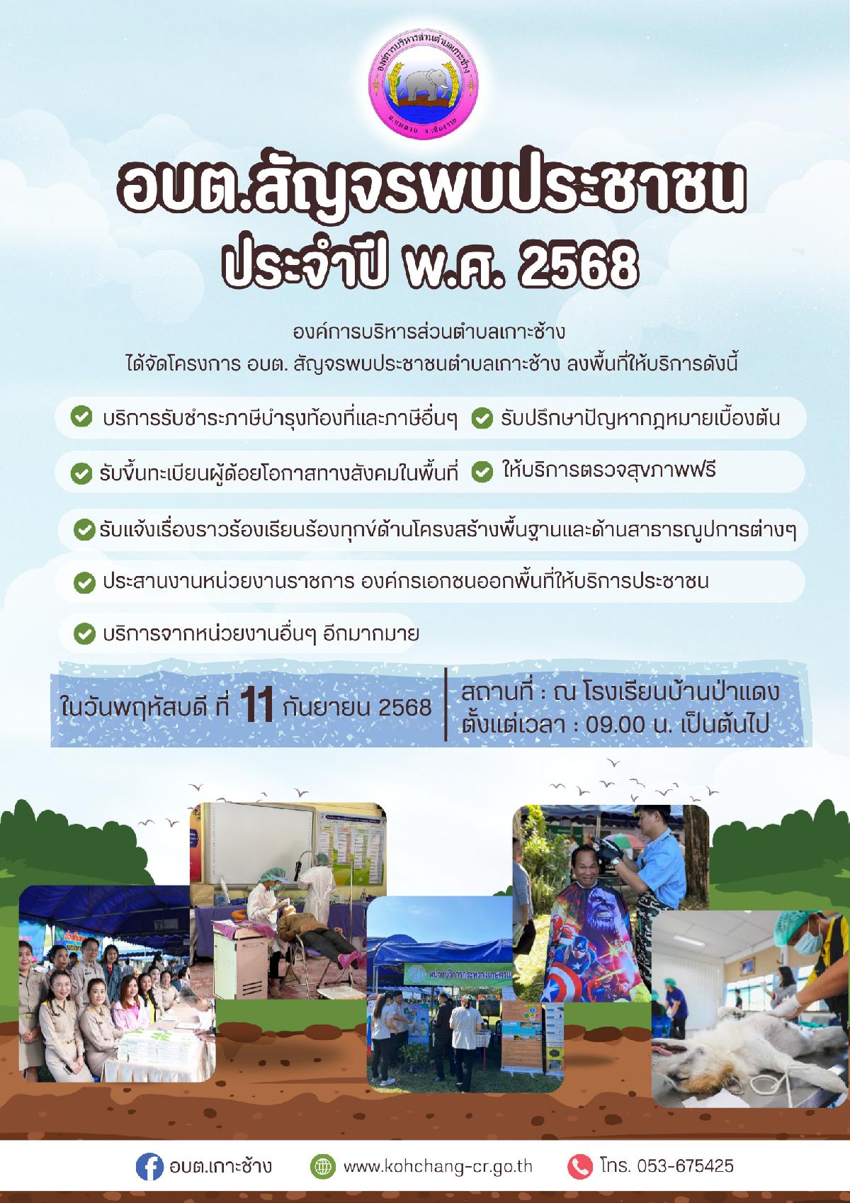 องค์การบริหารส่วนตำบลเกาะช้างได้จัดโครงการ อบต.สัญจรพบประชาชนตำบลเกาะช้าง ในวันพฤหัสบดี ที่ 11 กันยายน 2568 ตั้งแต่เวลา 09.00 น.เป็นต้นไป ณ โรงเรียนบ้านป่าแดง
