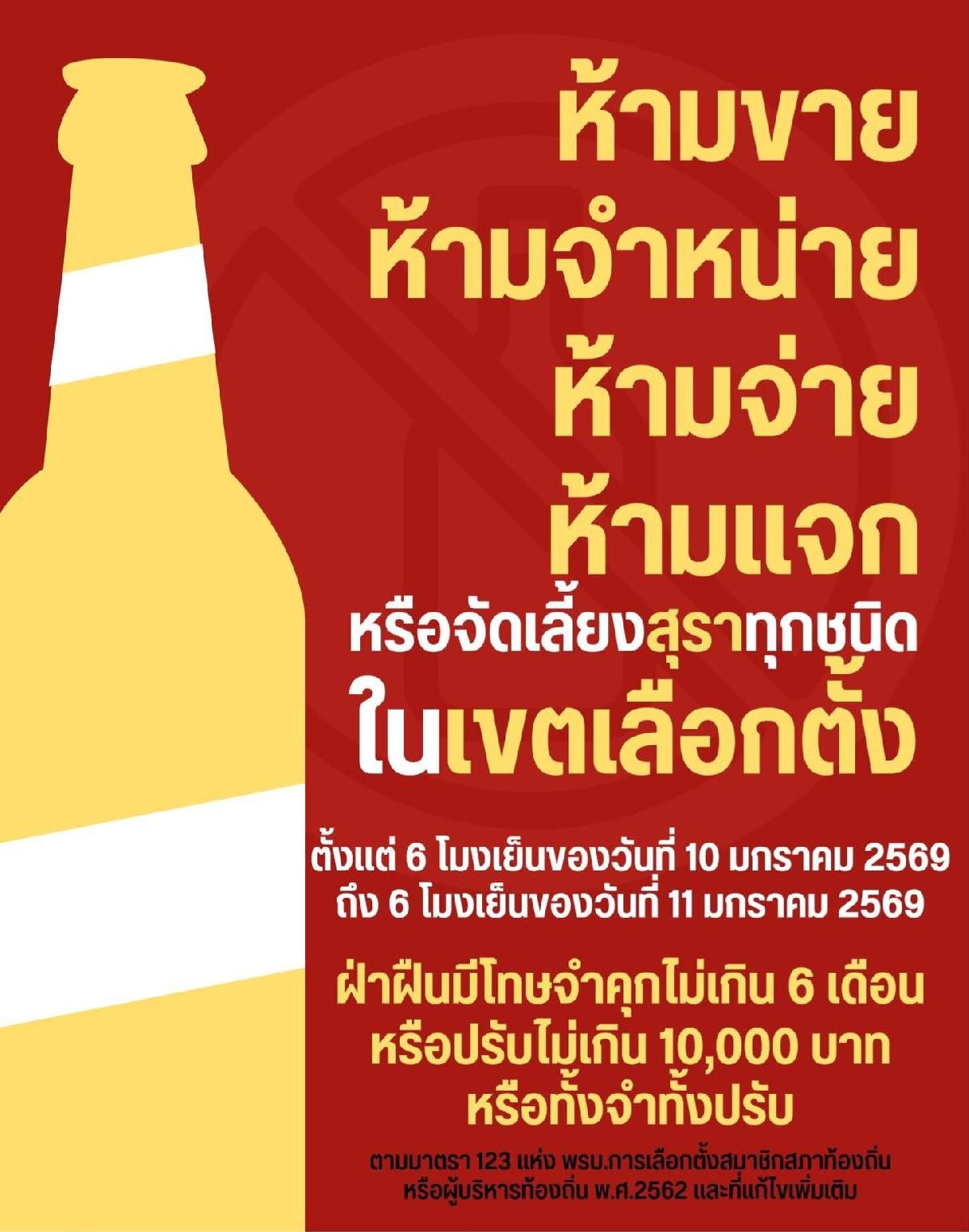 ประชาสัมพันธ์ ห้ามขาย ห้ามจำหน่าย ห้ามจ่าย ห้ามแจก หรือจัดเลียงสุราทุกชนิด ในเขตเลือกตั้ง ตั้งแต่เวลาหกโมงเย็นของวันที่ 10 มกราคม 2569 จนถึง หกโมงเย็นของวันที่ 11 มกราคม 2569